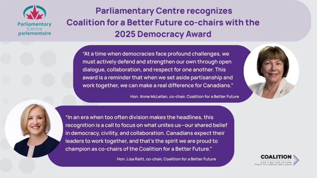 In recognition of their leadership the Parliamentary Centre has chosen the Co-Chairs of the Coalition for a Better Future as co-recipients of the 2025 Democracy Awards. We founded the awards to celebrate Canadians whose outstanding achievements safeguard and strengthen our democratic values and practices – Anne McLellan and Lisa Raitt’s high-level contribution to public policy after elected life is a true example of the resilience of democracy in challenging times.